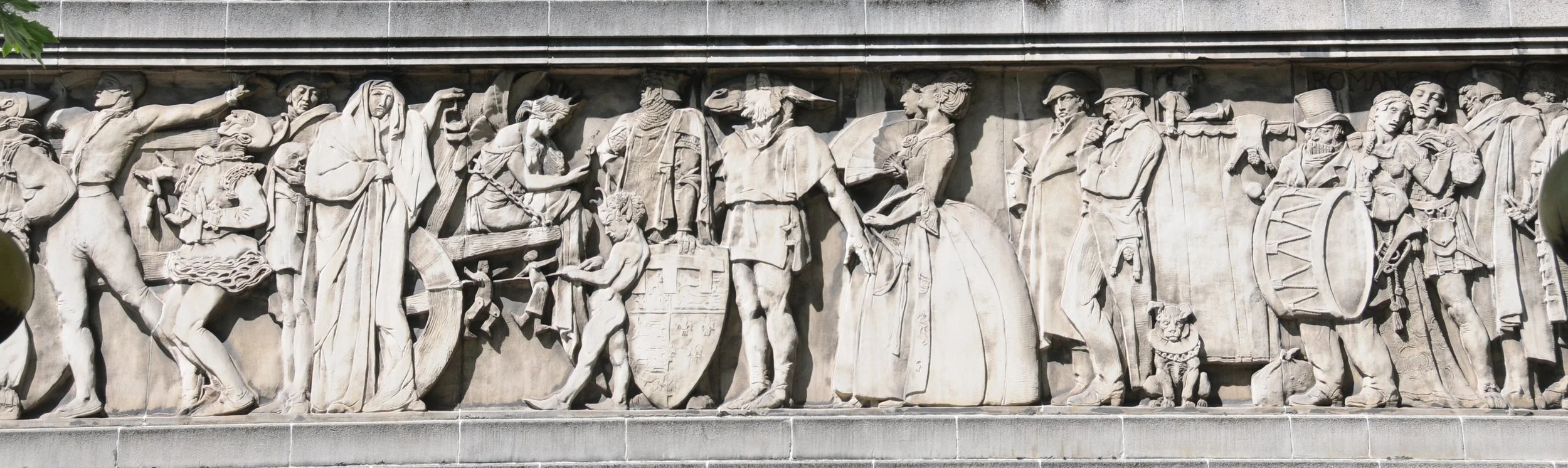 It includes Bacchanalia, Roman Gladiators and Commedia dell’Arte through to musical revues of the 20th century. Have a look at the detail. The little puppet near the barker with the big drum. You forget it is made of stone